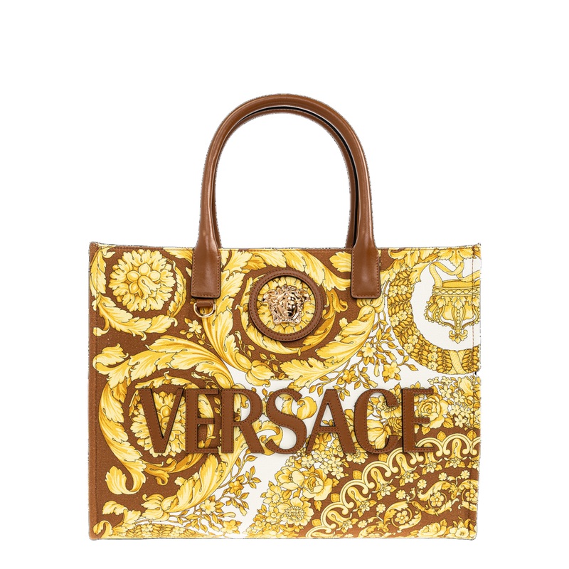 Measuring 42cm in width, 34cm in height, and 13cm in depth, this medium tote bag is spacious enough to accommodate your daily essentials while maintaining a sleek silhouette. The unique print reflects the bold aesthetics of Versace, ensuring you stand out in any crowd. Crafted from post-recycled materials, this tote not only elevates your style but also contributes to a more sustainable future, making it a conscious choice for the environmentally aware fashionista.