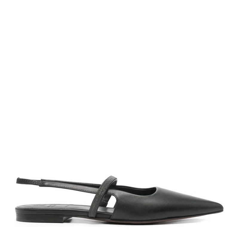 Elevate your footwear collection with the Black Calf Leather Pointed Toe Open Back Slingback Shoes from Brunello Cucinelli, where exquisite craftsmanship meets timeless style. Experience the union of luxury and functionality, as each step taken in these shoes is a testament to refined taste and unparalleled sophistication.