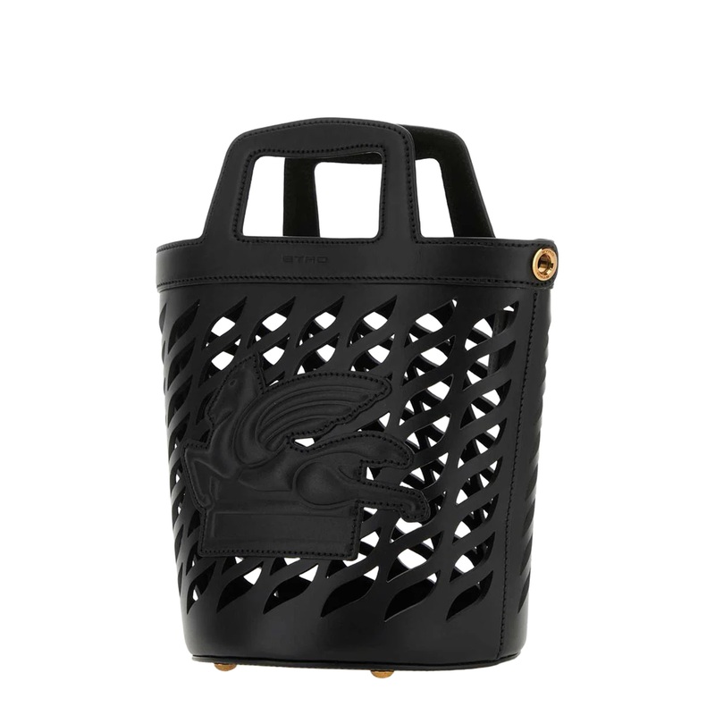 The ETRO Black Leather Coffa Bucket Bag is a stunning addition to any woman’s luxury fashion collection, perfectly designed for both casual and sophisticated occasions. Crafted from high-quality leather, this bag exemplifies elegance while ensuring durability. Its sleek black color complements any outfit, making it an ideal choice for the discerning fashionista.