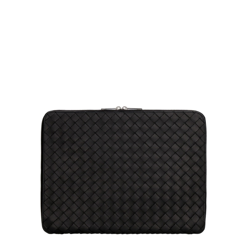 Featuring precise dimensions of 35.5cm in width, 27cm in height, and 2cm in depth, the Bottega Veneta Black Leather Pouch is spacious enough to hold your essential items while remaining compact and easy to carry. The zip closure ensures that your belongings are secure, making it a practical choice for daily use or evening outings.