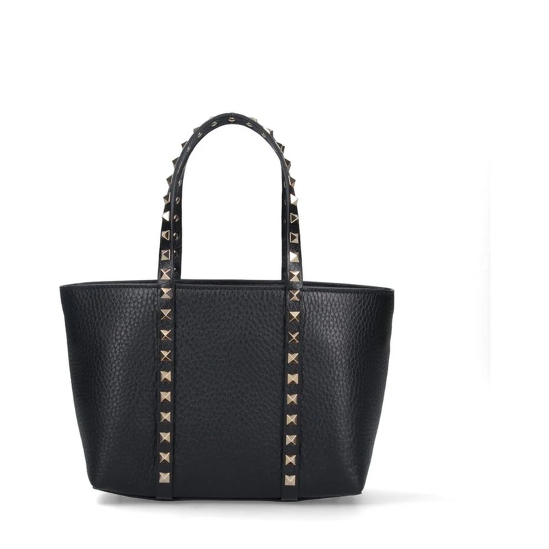 The Valentino Garavani Black Leather Small Rockstud Shopping Bag is a quintessential piece for the modern woman, perfectly blending style and functionality. This exquisite bag is crafted from high-quality calf leather, renowned for its pebbled texture that
