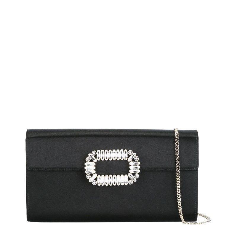 Indulge in the exquisite elegance of the Choc Clutch in Satin by Roger Vivier, a stunning accessory that redefines luxury. This sophisticated black silk embellished crossbody bag is the perfect blend of style and functionality, making it an essential addit