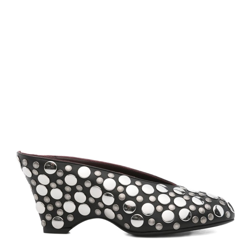 Indulge in the epitome of sophistication with the Cloak Studded Mules by Khaite. Crafted from premium black calf leather, these mules exemplify the brand's commitment to unparalleled luxury and exquisite craftsmanship. The standout feature of these mules i