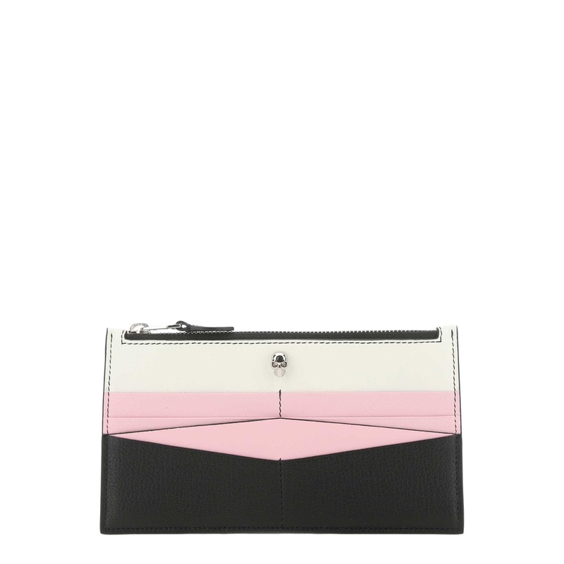 Experience the perfect blend of elegance and functionality with the Color Block Zip Wallet from the esteemed brand Alexander McQueen. This luxurious accessory showcases a stunning combination of black, pink, and white hues, making it a statement piece for