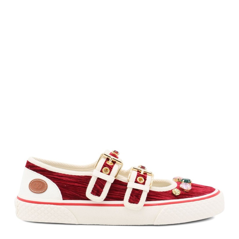 The Dollyboard Ballets are constructed from sumptuous dark red velvet, creating a rich texture that is both visually striking and undeniably luxurious. The unique combination of velvet and leather not only enhances the overall aesthetic but also ensures durability and comfort. Each pair features a double buckle fastening adorned with jewel embellishments, adding a touch of opulence that reflects the hallmark of Valentino craftsmanship.