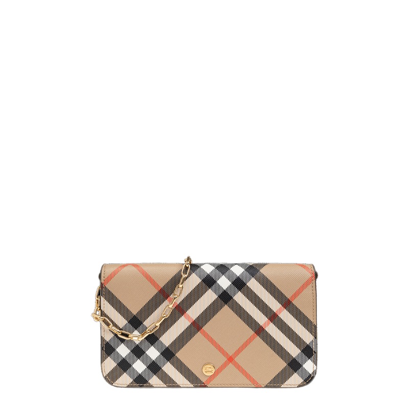 Introducing the Elegant Chain Wallet by Burberry, an exquisite fusion of sophistication and practical design. This captivating accessory, part of Burberry's exclusive collection, showcases English elegance with its iconic check pattern, primarily featuring