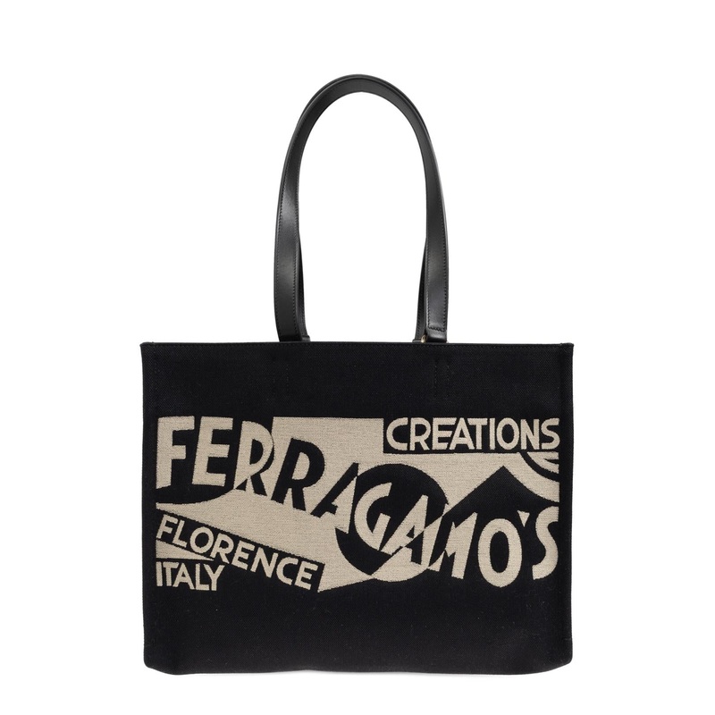 - Large beige print on the front showcasing “FERRAGAMOS CREATIONS FLORENCE ITALY”