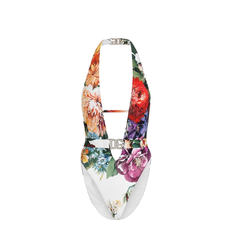 The standout feature of this Floral Print Swimwear is its stunning all-over floral print, which captures the essence of summer in full bloom. The low back design adds an element of allure, making it a perfect choice for those who wish to make a statement. Completing the luxurious look is a delicate white logo-buckle fastening that subtly showcases the iconic Dolce & Gabbana brand.