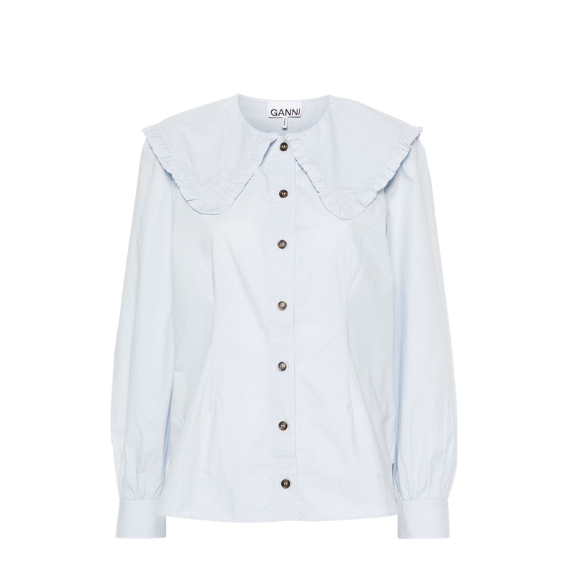 Crafted from 100% organic cotton, this shirt not only exemplifies luxury but also embodies sustainability. With a light blue hue, it brings a refreshing touch to your ensemble, perfect for both spring and summer seasons. The poplin texture combined with a puritan collar and ruffled trim adds a unique flair, showcasing the high-quality craftsmanship that Ganni is celebrated for.