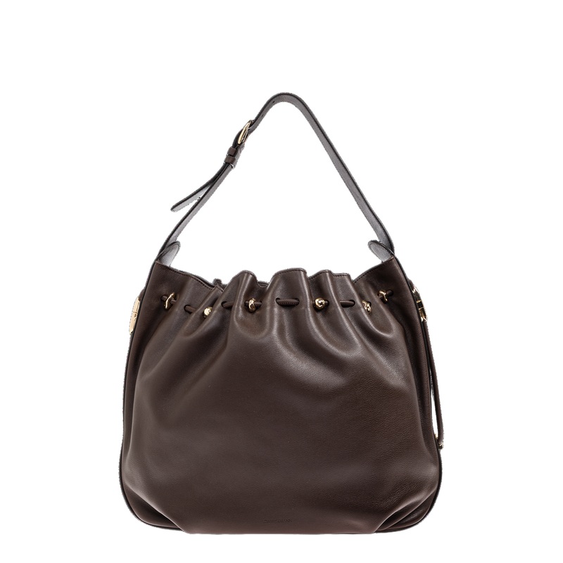 The Halcyon Large Bucket Shoulder Bag is presented in a deep, rich shade of brown, offering a timeless appeal that complements any wardrobe. Its unique bucket shape features a subtle pleating effect under the closure top, adding an enchanting charm that enhances its overall aesthetic. The thoughtful design is accentuated by gold-toned metal details, providing an exquisite embellishment that elevates the bag’s luxurious vibe.