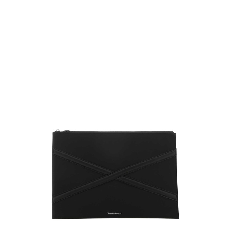 The Harness Nylon Pouch-Bag with Logo from Alexander McQueen is a quintessential accessory that seamlessly combines luxury with functionality. This stylish black handbag is designed for the modern man and is crafted from high-quality nylon accented with le