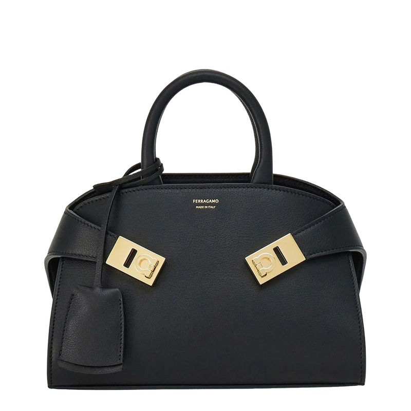 The Salvatore Ferragamo Hug Mini Bag is the epitome of luxury and sophistication. Crafted from high-quality calfskin, this elegant black mini bag is perfect for those who appreciate refined fashion. With its sleek dimensions of 22.5cm in width, 14cm in height, and 11cm in depth, it is designed to carry your essentials while making a style statement.