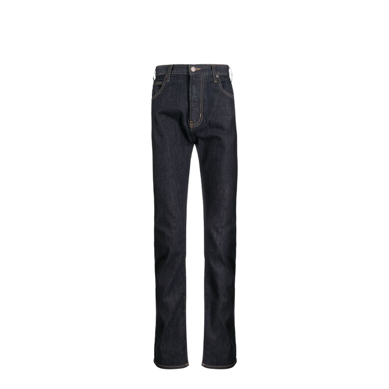 Discover the epitome of sophisticated style with the Indigo Blue Stretch-Cotton Dark Wash Low-Rise Slim Cut Jeans from Emporio Armani. Crafted with meticulous attention to detail, these jeans effortlessly blend comfort with contemporary fashion, making the