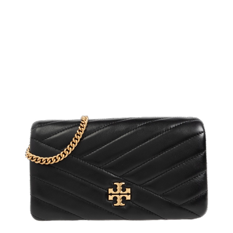 Indulge in the exquisite allure of the Kira Chevron Crossbody by Tory Burch, a true masterpiece that harmonizes luxury and practicality. This stunning wallet-on-chain showcases a sleek rectangular silhouette, meticulously crafted from the finest quality leather. Its smooth texture and rich black hue exude sophistication, while the distinctive quilted patterns create diagonal lines that elevate its aesthetic.