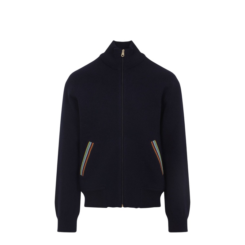 This standout piece features a navy blue zip fastening that not only provides practicality but also adds a sleek aesthetic, ensuring you remain stylish and warm. The high neck design offers extra protection against chilly winds, while the ribbed cuffs provide a snug fit, enhancing the overall silhouette. The striking striped detailing adds a pop of color, further highlighting Paul Smith’s signature flair for sophistication and creativity.