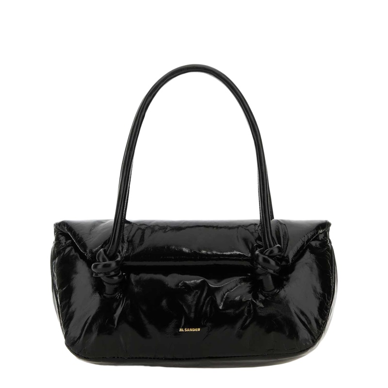 The Knot Small Black Shoulder Bag With Laminated Logo In Patent Leather by JIL SANDER is a striking accessory that embodies sophistication and elegance. Crafted from high-quality patent leather, this luxurious shoulder bag is designed to elevate your style