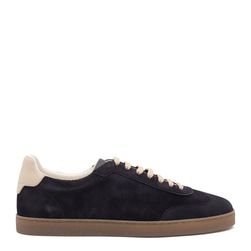 The Leather-Trimmed Suede Sneakers feature a dark blue suede upper, exuding elegance and versatility. With exquisite beige leather detailing, these sneakers provide a refined touch that complements any ensemble. The flat laces ensure a secure fit, while the rubber sole offers durability and traction, making them perfect for both city strolls and leisurely weekends.
