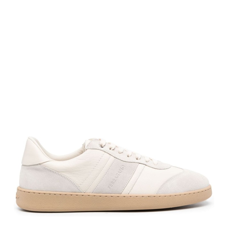 Featuring a unique panelled design, these sneakers showcase a subtle yet striking ivory white/light grey palette that effortlessly complements a variety of outfits. The debossed logo at the side and on the tongue adds a sophisticated branding element, while the logo at the sole and internal logo patch further emphasizes Ferragamo’s commitment to excellence in craftsmanship.
