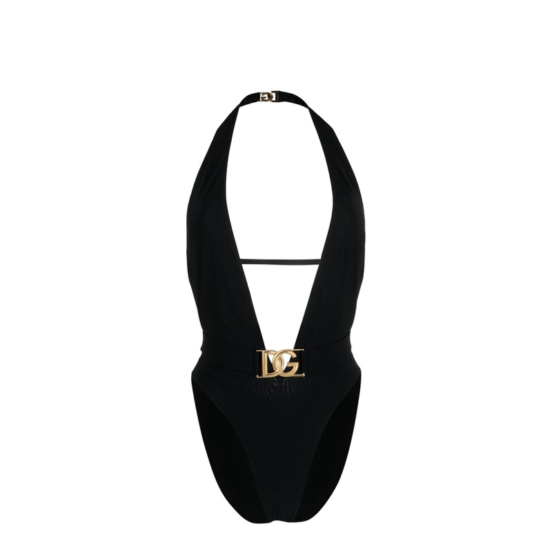 The standout feature of this one-piece swimsuit is its plunging V-neck halterneck design, elegantly revealing the collarbone while offering a chic and stylish look. The gold-tone logo plaque adds a touch of opulence, embodying the signature aesthetics of Dolce & Gabbana. The rear clasp fastening ensures a secure fit, allowing you to move with confidence whether lounging by the pool or strolling along the beach.