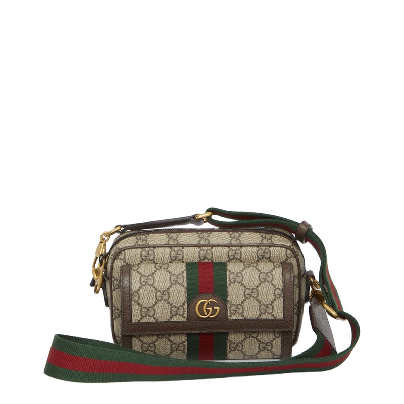 With dimensions of 19.5cm width, 13cm height, and 4.5cm depth, the Ophidia Mini Canvas Bag – Beige offers ample space for your essentials while maintaining a compact silhouette. This bag features a convenient top zipped fastening and a stylish front flap pocket, allowing for easy access to your belongings. The expertly designed adjustable shoulder strap adorned with the signature green and red stripe details adds a distinctive GUCCI flair.