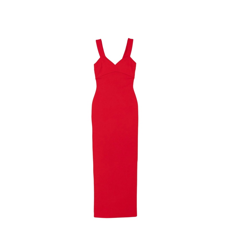 Red Sleeveless Design V-Neckline Fitted Bodice Maxi Length Straight Skirt
