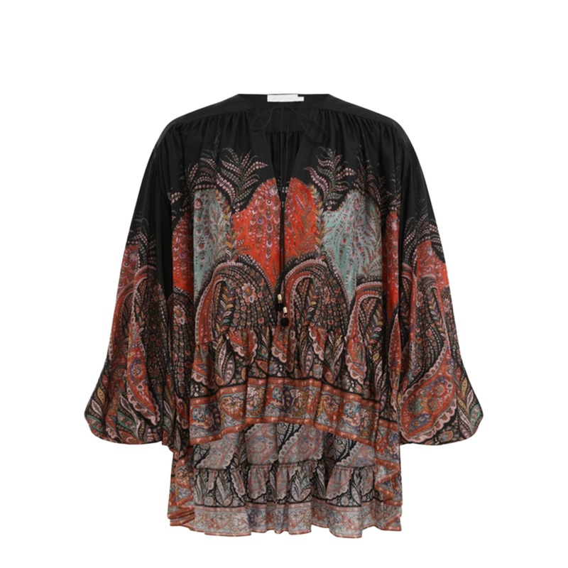 Indulge in the exquisite charm of the Rhiannon Ruffle Billow Blouse from Zimmermann, a stunning piece that embodies both romance and sophistication. Crafted from 100% silk, this luxurious blouse features a captivating black paisley print that elevates any