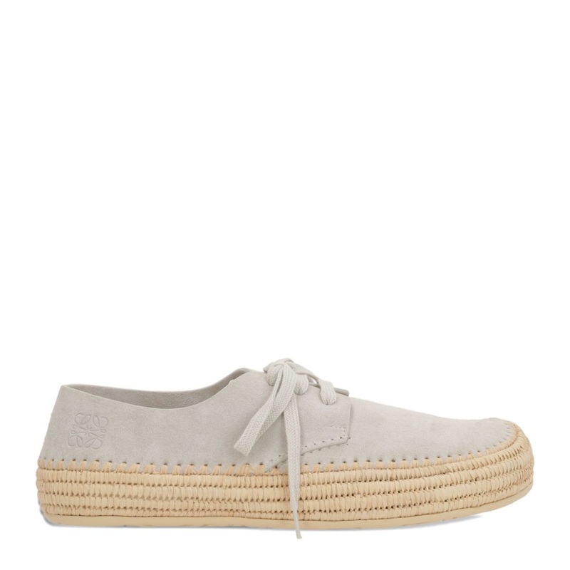 Elevate your footwear collection with the exquisite Rio Lace-Up Shoes in Suede by Loewe. Crafted with meticulous attention to detail, these shoes embody the perfect blend of sophistication and contemporary style. Featuring a light grey suede upper, the foo