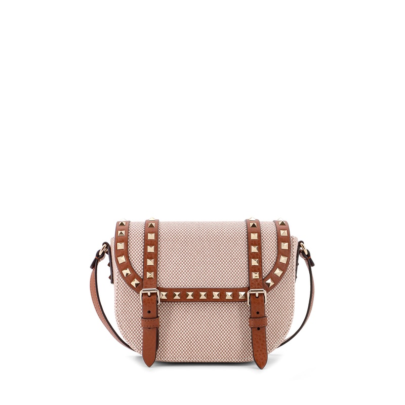 The VALENTINO GARAVANI Rockstud Foldover Top Shoulder Bag is a stunning accessory that combines elegance with functionality, perfect for the modern woman. Crafted from a luxurious blend of 90% canvas and 10% leather, this bag boasts a chic beige color that