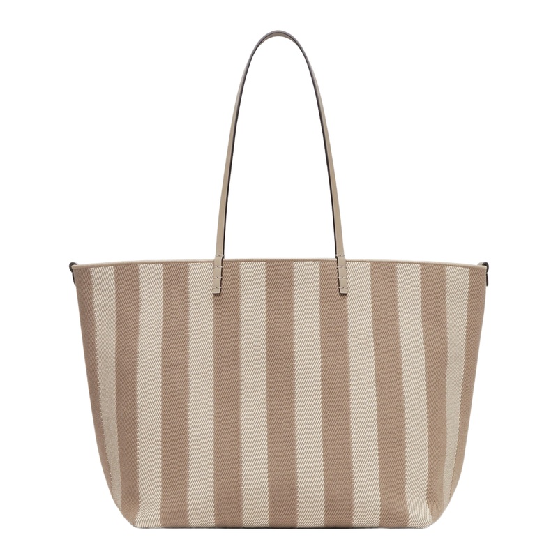 The FENDI Large Reversible Shopper Handbag is the epitome of luxury fashion, designed to elevate any ensemble. This exquisite handbag features a unique dual design, combining functionality with high-end style. One side is adorned with a chic dove gray Pequin stripe pattern, while the reverse showcases a solid material embellished with the iconic FF motif. Crafted from premium Pequin stripe canvas and leather, this handbag exemplifies FENDI’s commitment to quality and sophistication.