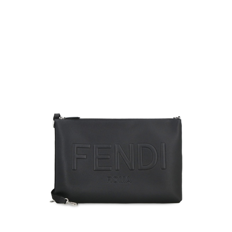 The FENDI Leather Handheld Clutch is not only visually striking but also includes a practical wrist strap, allowing for easy transportation and versatility. It is designed with embossed Fendi Roma lettering that adds an extra layer of luxury, complemented by palladium-finish metalware that enhances its elegant appeal. This piece is thoughtfully crafted to cater to the style needs of the contemporary man, making it an essential accessory for those who appreciate fine detail and quality.