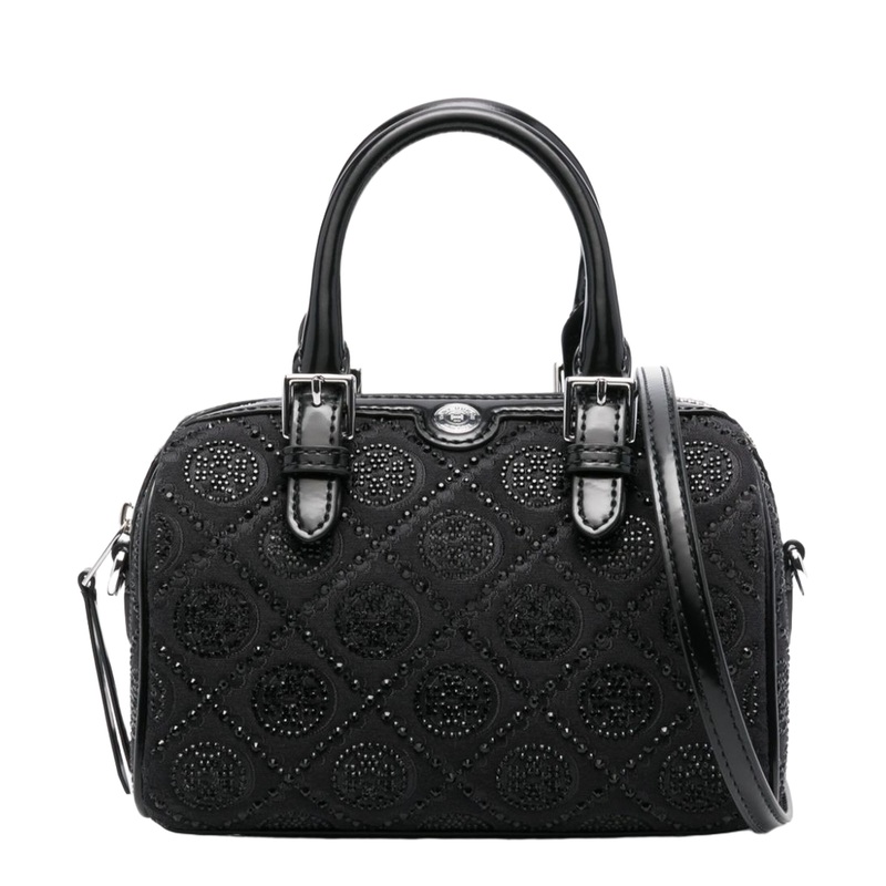 The T Monogram Hotfix Petite Barrel Bag by Tory Burch is a stunning representation of casual luxury that effortlessly combines style and functionality. Crafted from high-quality 100% canvas in a sleek black hue, this bag is ideal for those seeking a chic a