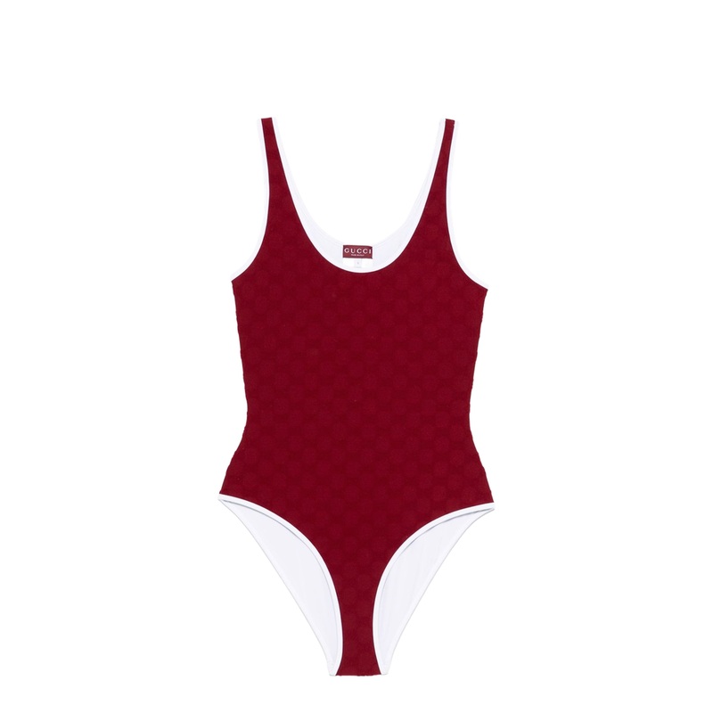 Indulge in the epitome of luxury with the Terrycloth Jersey Jacquard Swimsuit in Rosso Ancora Red by Gucci. This exquisite swimsuit blends high-fashion aesthetics with unparalleled comfort, making it a must-have for the discerning swimwear enthusiast. Crafted from premium GG terrycloth jersey, this swimsuit is designed to elevate your beach or poolside experience, ensuring you stand out with sophistication.