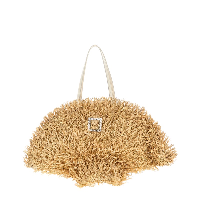 The Trs Vivier Large Shopping Bag stands out with its refined design, measuring 70cm in width, 35cm in height, and 17cm in depth. Its natural color allows for versatile styling, adapting seamlessly to any wardrobe. Made from 90% raffia and 10% calfskin, this bag showcases a luxurious yet casual aesthetic, a signature of the Roger Vivier brand.