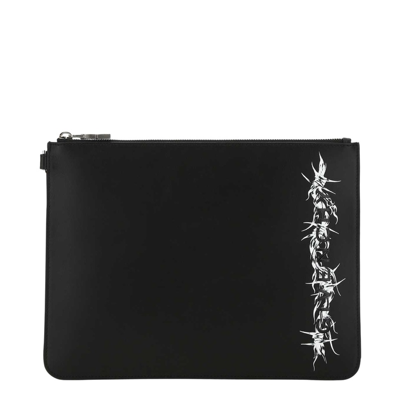 This striking black pouch stands out with its unique painted effect logo on the front, making a bold statement without compromising practicality. The silver finish metallic parts add a touch of glamour, enhancing the overall aesthetic. Designed for the modern individual, the GIVENCHY Voyou Pouch features a secure zip closure, ensuring your essentials are safe and easily accessible. Inside, it offers an inner pocket for added organization, making it an ideal choice for anyone on the go.